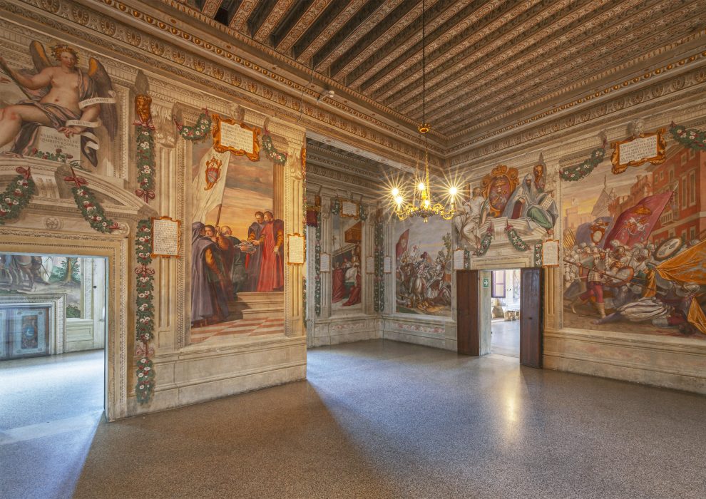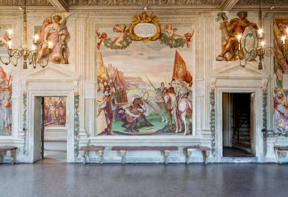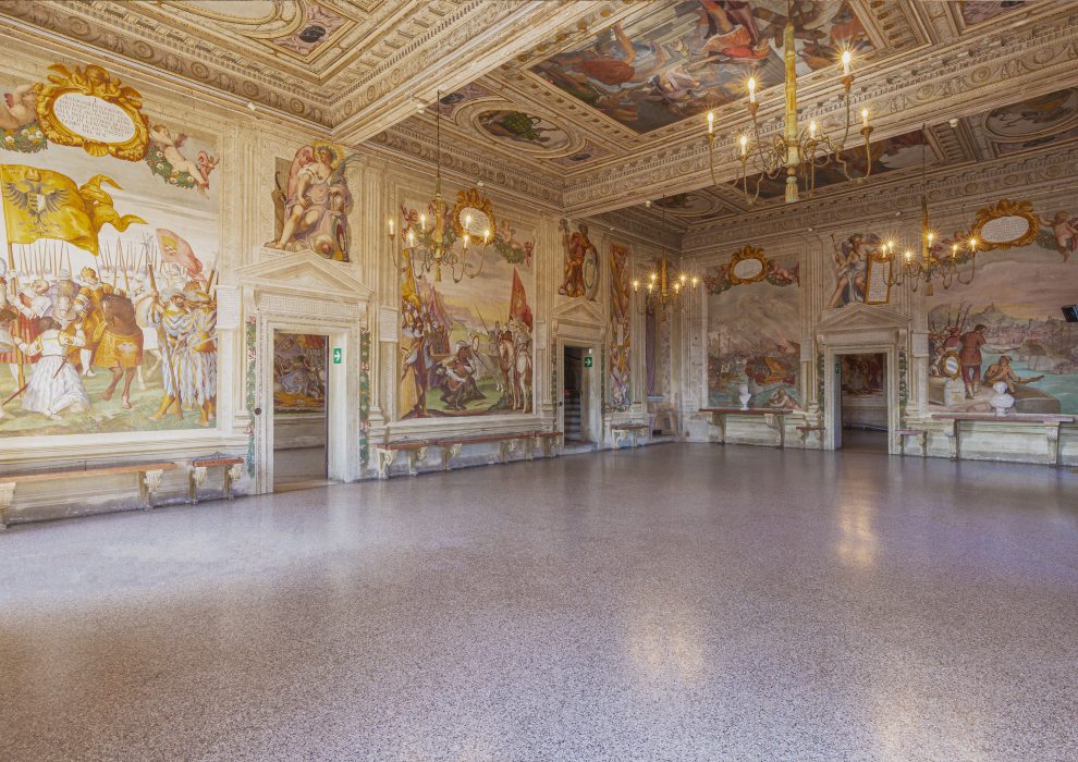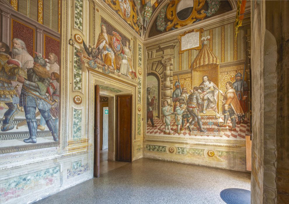 Il Castello del Catajo a Battaglia Terme, a metà tra il castello militare e la villa principesca, sorge ai piedi dei Colli Euganei sul Montenuovo, area appartenuta alla famiglia degli Obizzi (originaria della Borgogna, in Francia, si stabilì nel territorio della Repubblica di Venezia attratta dalla bellezza dei luoghi) dal 1422, quando Antonio si unì in matrimonio all’ereditiera padovana Negra de’ Negri, che portò in dote il territorio di Battaglia Terme. La presenza di una casa, con corte, brolo e colombara, di proprietà di Antonio degli Obizzi, è documentata dal 1443; la costruzione di una prima villa va tuttavia collocata nel secolo successivo e precisamente fra il 1530 e il 1541. In quegli anni Gasparo degli Obizzi fece edificare una residenza con logge e giardini pensili proprio sulla sommità dell’altura; la sua posizione, in corrispondenza della confluenza del rio Rialto con il canale Battaglia, doveva motivare il curioso appellativo “Catajo” storpiatura del toponimo Ca’ del Taglio (in dialetto veneto taio), indicante uno scavo nella roccia del monte finalizzato al deflusso delle acque. Alla morte di Gasparo, la villa venne ereditata dalla moglie Beatrice Pia, che ne fece un luogo di incontri letterari ben conosciuto all’epoca. Il Castello vero e proprio venne però costruito a partire dal 1565 per volere del figlio, il condottiero della Repubblica di Venezia Pio Enea I degli Obizzi, famoso per aver inventato l’obice, deciso a edificare un palazzo che testimoniasse il valore militare della sua famiglia. Per oltre quindici anni Pio Enea si occupò di persona del progetto architettonico, valendosi forse della collaborazione del proto di Santa Giustina a Padova, Andrea da Valle. La fabbrica preesistente, con i giardini, venne inglobata in un complesso di ampliate dimensioni, mentre il Castelvecchio, costruito ex novo, si presentava come una sorta di imponente fortezza coronata da merlature e dotata di posti di guardia, di mura di recinzione e di un ponte levatoio. Se gli scenografici giardini con fontane facevano parte di un complesso programma iconografico, la decorazione degli interni non lasciava dubbi: lo stesso Betussi ispirò gli affreschi di carattere celebrativo che occupavano le pareti delle sale del piano nobile e che narravano le origini degli Obizzi e le vicende dei membri più noti della famiglia, condottieri al servizio di vari Stati Italiani, da Lucca allo Stato Pontificio, alla Serenissima. Gli affreschi vennero eseguiti dal pittore veneto, voluto dall0 stesso pio Enea, Giambattista Zelotti (allievo di Paolo Veronese) e dalla sua bottega fra il 1571 e il 1573. Con Pio Enea II, nipote di Pio Enea I, il Catajo subì alcune importanti trasformazioni, tra cui la sopraelevazione del viale principale; Tommaso, sul finire del XVIII sec., volle poi la costruzione dell’arco trionfale all’ingresso e arricchì il castello con collezioni d’armi, di strumenti musicali, di reperti archeologici e di monete. Nel corso del XIX secolo, il Castello passò in eredità prima agli Este, duchi di Modena, poi agli Asburgo, che trasferirono a Vienna le pregiatissime collezioni di armi e di reperti archeologici. Infine dopo la prima guerra mondiale il Catajo fu assegnato al governo italiano come riparazione dei danni di guerra ed esso poi lo vendette alla famiglia Dalla Francesca nel 1929, attuale proprietaria.