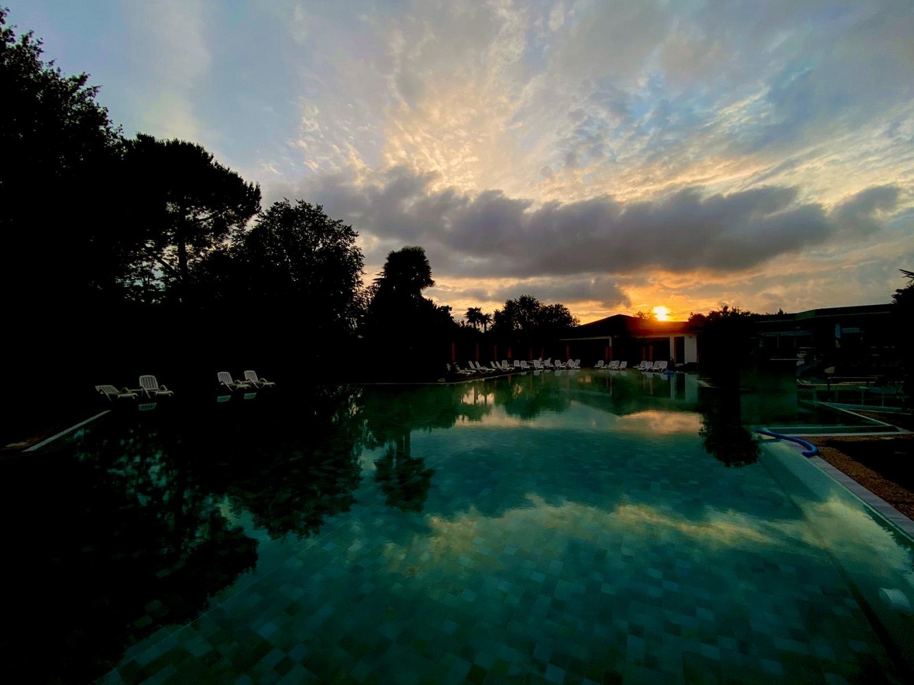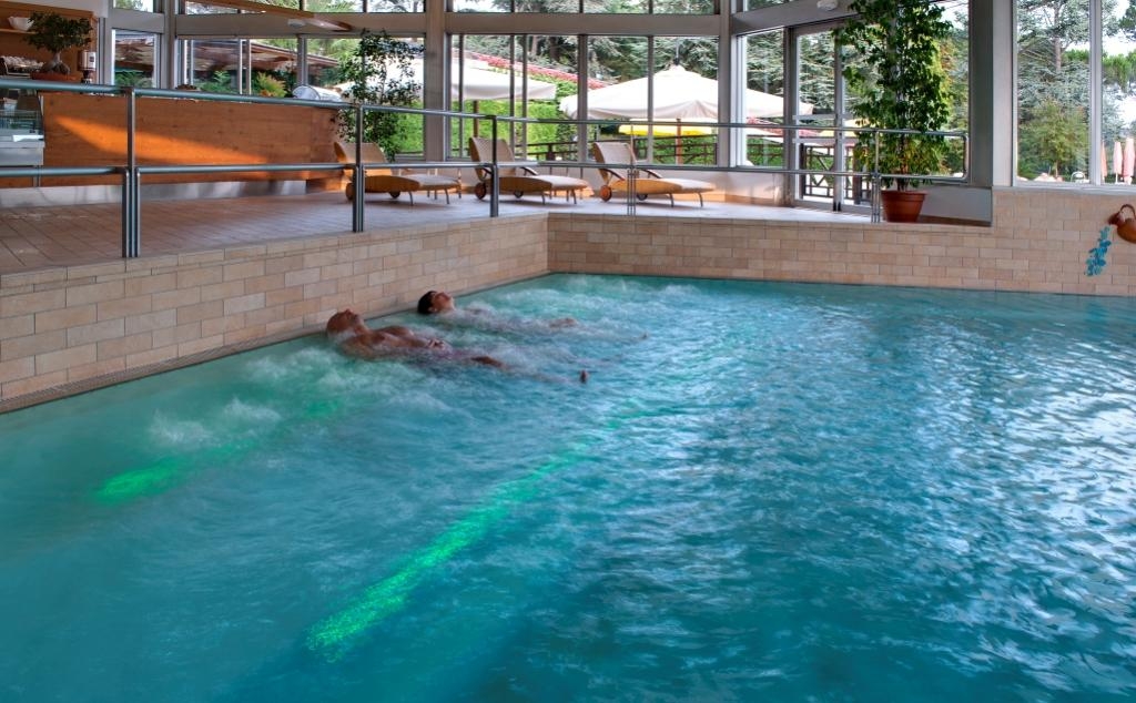 Hôtel élégant, 50000 mC jardin, chambres/suites (TV Sat/écran plat 40”, internet inclus), restaurant (aussi végétarien où alimentation vegane), menu sans gluten, Salle Indien, Salle relax Birmanie, 3 piscines 1200 mc, grotte thermale, bain vapeur, sauna finlandais, musique subaquatique, Jacuzzi, parcours Kneipp, boue thermale, aqua healing, spa, massages, ayurvéda, fitness, tennis, esthéticienne, Cert. Qualité ISO 9001-2015, tai chi, nordic walking, visite élevage algues, salle réunion, terrain de jeu.