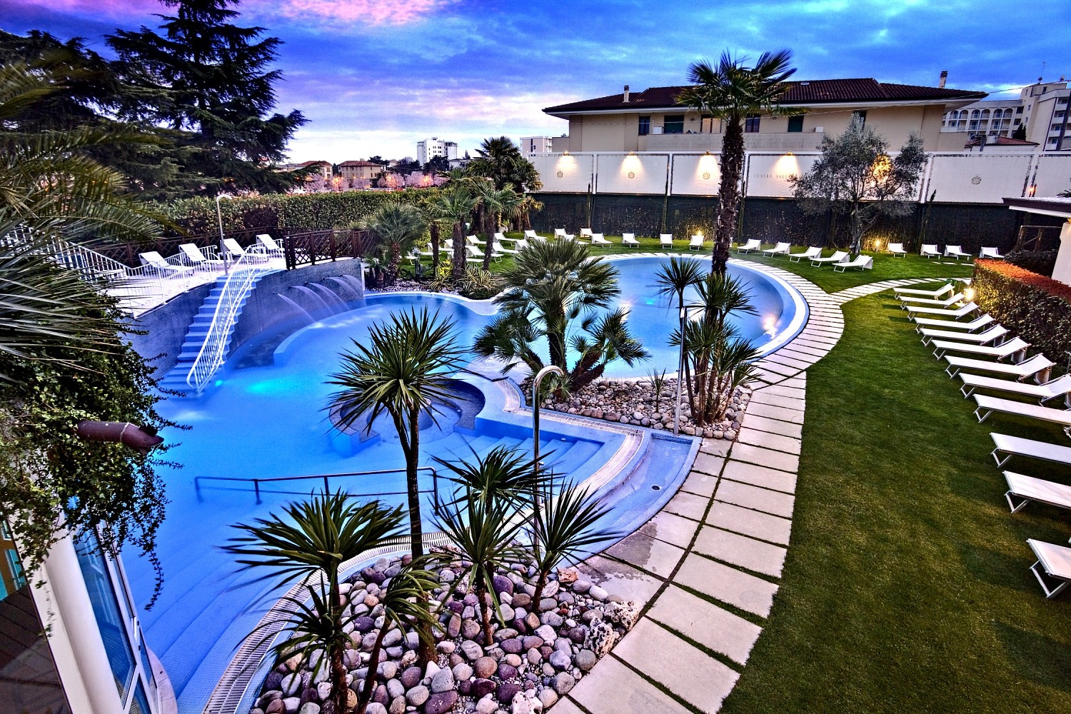 Il Centro Benessere include: 2 piscine termali comunicanti, whirlpool, percorso giapponese, cascate cervicali, grotta con frigidarium, percorso Kneipp, idroparadiso, zona relax/detox "salis" con sale dell'Himalaya, sauna, palestra (07.30-19.30), aquagym di gruppo (18.15-18.45 escluso domenica), servizio tisaneria (16.00-17.30), wellness bar - acque aromatizzate (dalle 16.30).