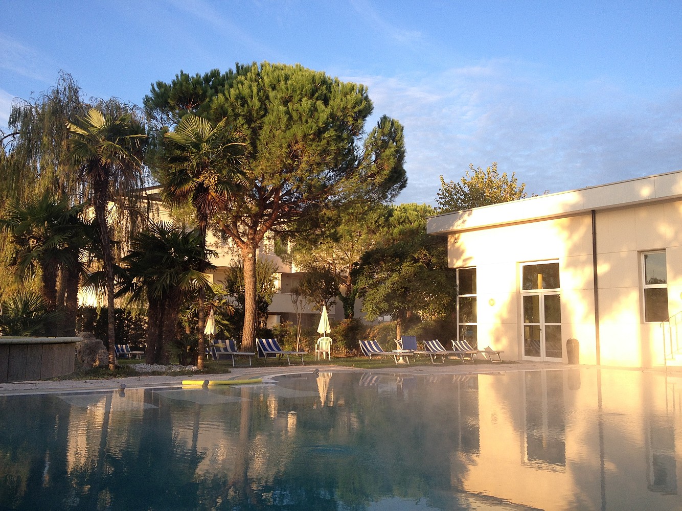 Le due piscine termali coperta e scoperta comunicanti circondate da un ampio parco, Vi permetteranno di trascorrere ore di autentico relax. Potrete utilizzare anche la sauna, la tipica grotta termale, la doccia Kneipp e la palestra. L'ampio e splendido spazio verde in cui esse sono immerse, le palme e la vegetazione da cui sono circondate ne fanno una vera e propria oasi di pace, dove potrete prenderVi cura del Vostro benessere fisico tra giochi d'acqua e idromassaggi alternate a divertenti lezioni di acquagym.