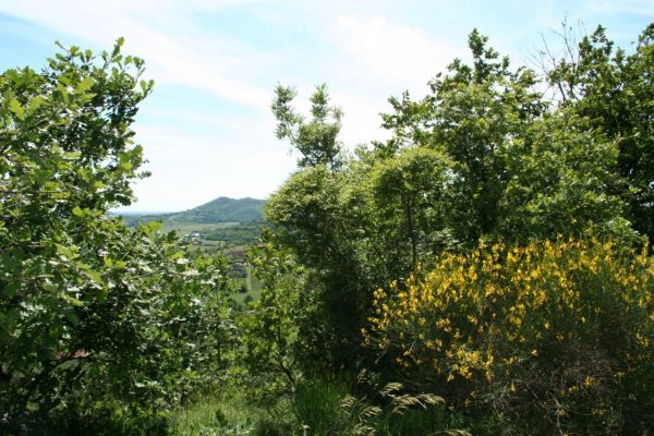 Dopo aver attraversato il boschetto raggiungerete un prato arido da cui godere della vista il panorama scorgendo i monti Castello, Cero e Piccolo. In questa zona la vegetazione è costituita da rosa canina, robinia, qualche ailanto e carpino nero sparso, erba solfina e geranio purpureo.