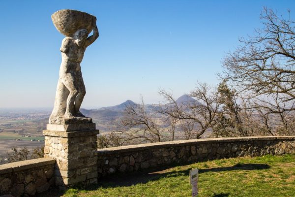 La strada asfaltata che sale in direzione sud-ovest dietro alla stazione di Monselice segna l’inizio del Sentiero del Monte Ricco e del Monte Castello. Si tratta di un percorso di 5 km, senza difficoltà perché privo di grosse pendenze. Si arriva in prossimità di una casa rossa e da qui si prosegue verso ovest, per poi giungere alla suggestiva terrazza panoramica dominata dalla statua di Ercole che sorregge il mondo. Da qui potrete osservare a est la Rocca di Monselice, a ovest il profilo del campanile di Calaone, tra i monti Cero e Castello di Baone, mentre a sud la vista decisamente meno poetica di una cementeria dismessa. Sulla destra si trova una scalinata che conduce all’Eremo di Santa Domenica dei frati francescani. Da qui potrete proseguire verso sinistra in direzione di Monte Castello, o verso destra per il sentiero più breve. In entrambi i casi sarete accompagnati dall’alternarsi tra querce e castagni e macchia mediterranea a seconda dell’esposizione dei versanti.