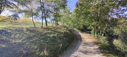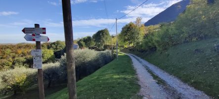 Salite poi per un centinaio di metri fino ad arrivare al pianoro degli ulivi, e poi ancora su un percorso che alterna sentiero pianeggiante a dolci discese lungo un vigneto. Dopo una breve salita e un tratto pianeggiante vi troverete sulla strada asfaltata tra Teolo e Rovolon.
